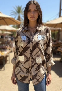 This relaxed-fit plaid shirt blends classic comfort with a touch of modern flair. Crafted in warm neutral tones, it features rolled sleeves and a slightly longer, rounded hem for an easy, effortless silhouette. Unique patterned patches on the chest add a playful, stylish twist to the traditional plaid design. Soft, lightweight, and perfect for layering, this shirt is an ideal choice for casual days, pairing beautifully with jeans, leggings, or sneakers for a laid-back yet put-together look.